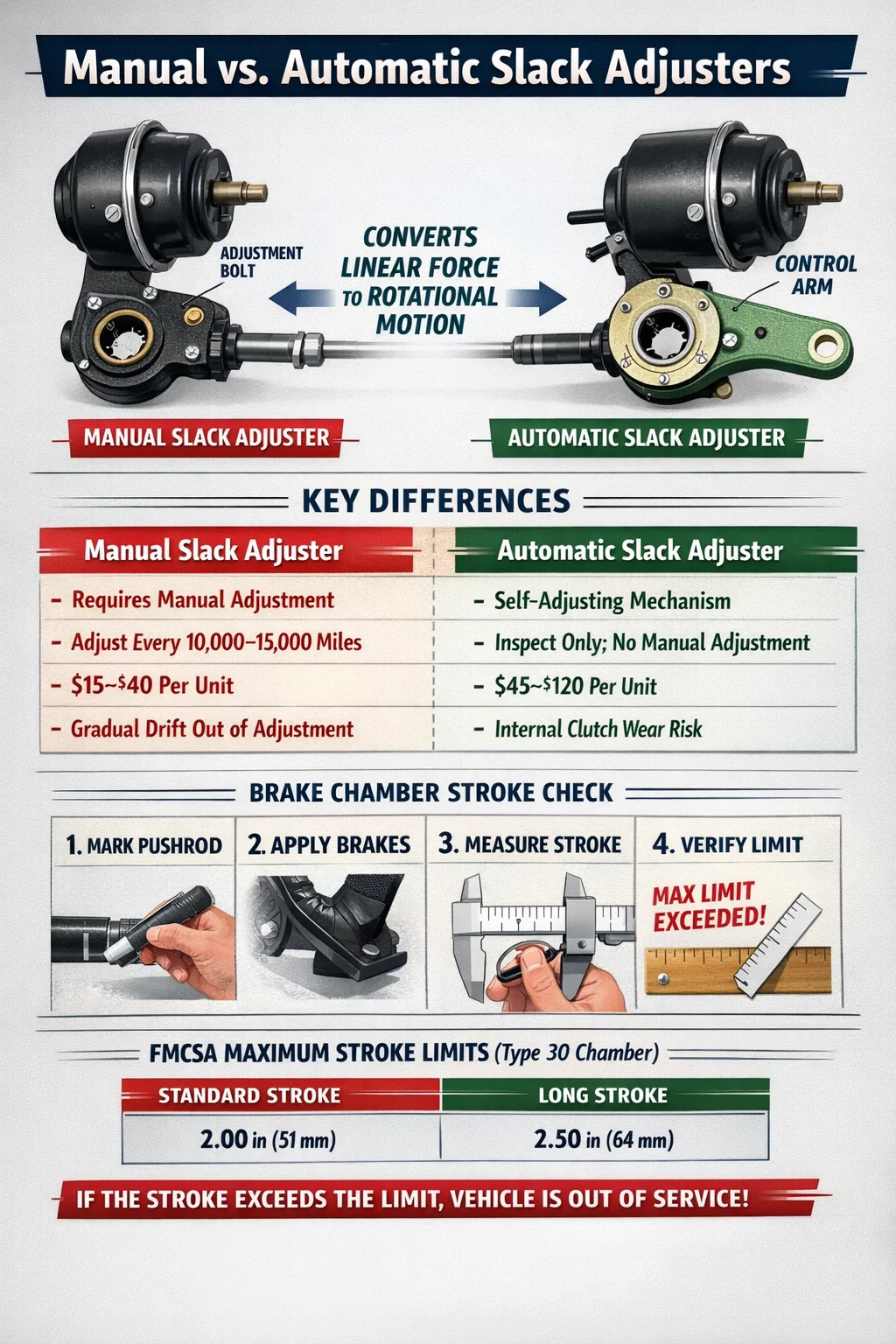 FMCSA-määräysten mukaan lain edellyttämä suurin jarrukammion iskunpituus Pohjois-Amerikassa määräytyy kammion koon mukaan – tyypin 30 kammiossa tämä raja on 2 tuumaa (51 mm). Kun se ylitetään, ajoneuvo poistetaan käytöstä. Löysysäädin, joka on epäsäädössä, takertunut tai kulunut, on yksi yleisimmistä syistä, miksi kaupalliset kuorma-autot eivät läpäise tason I tienvarsitarkastuksia.